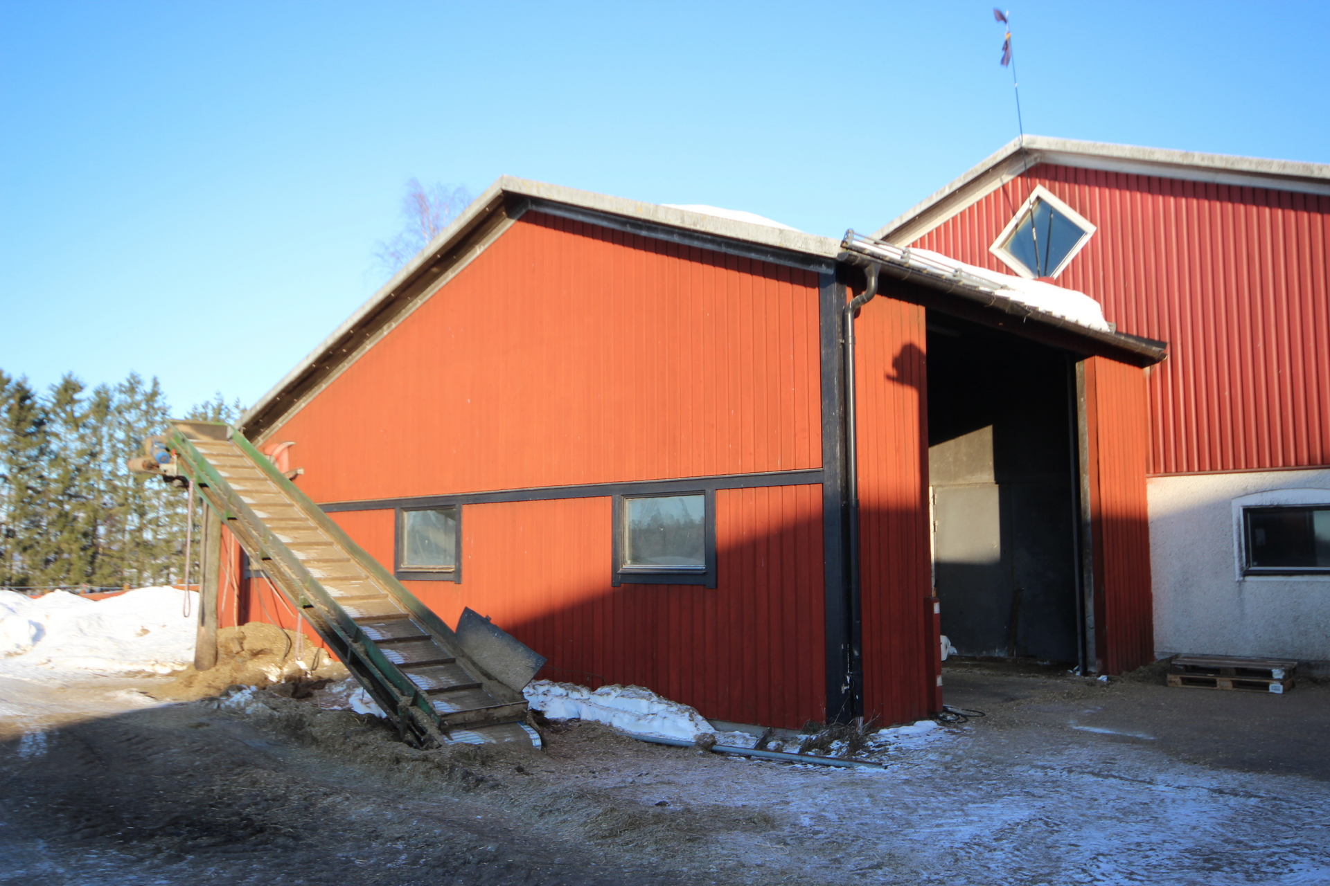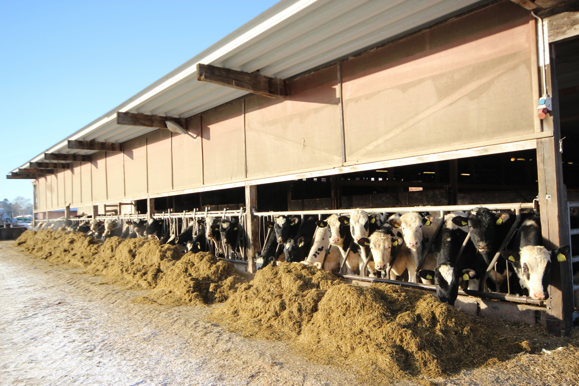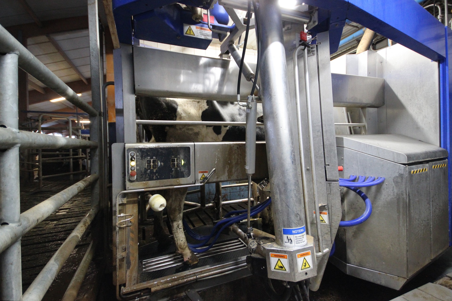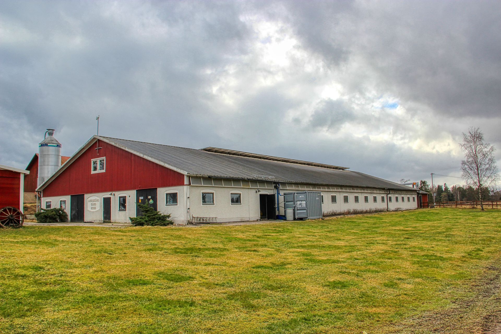 Beskrivning: Byggnad i betong med plåttak. Ligghall med 120 st. liggbås med inredning och madrasser från DeLaval. Ligghallen är delvis ombyggd med nya flexiva båsavskiljare i plast. Utgödsling med öppna skrapgångar till kulvert och pumpbrunn. Tre mjölkningsrobotar från Alfa Laval Två stycken VMS V300 årsmodell 2021 och en med årsmodell 2013. Fullfodersystem med bandtransportör, nockventilation med luftinsläpp vid takfoten. Gårdskontor och inredd övervåning. Mjölkrum med bufferttank och värmeväxlare för värmeåtervinning av mjölken, maskinrum med vacuumpumpar samt kompressorrum, utvändigt i egen byggnad. Nybyggt, år 2021, chaufförsrum intill DeLaval silotank 15 000 l. Intill stallet finns en kraftodersilo Mafa Unik 27 m³. Gödselbrunn i betong samt gödselbassäng med gummiduk, total kapacitet ca 5 000 m³.