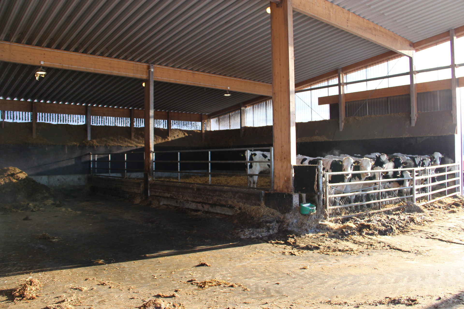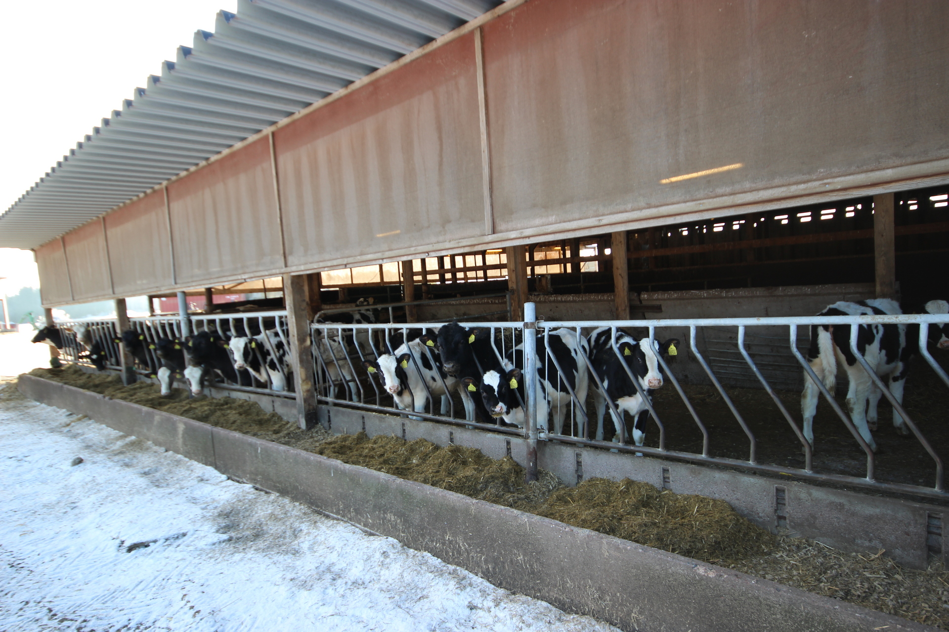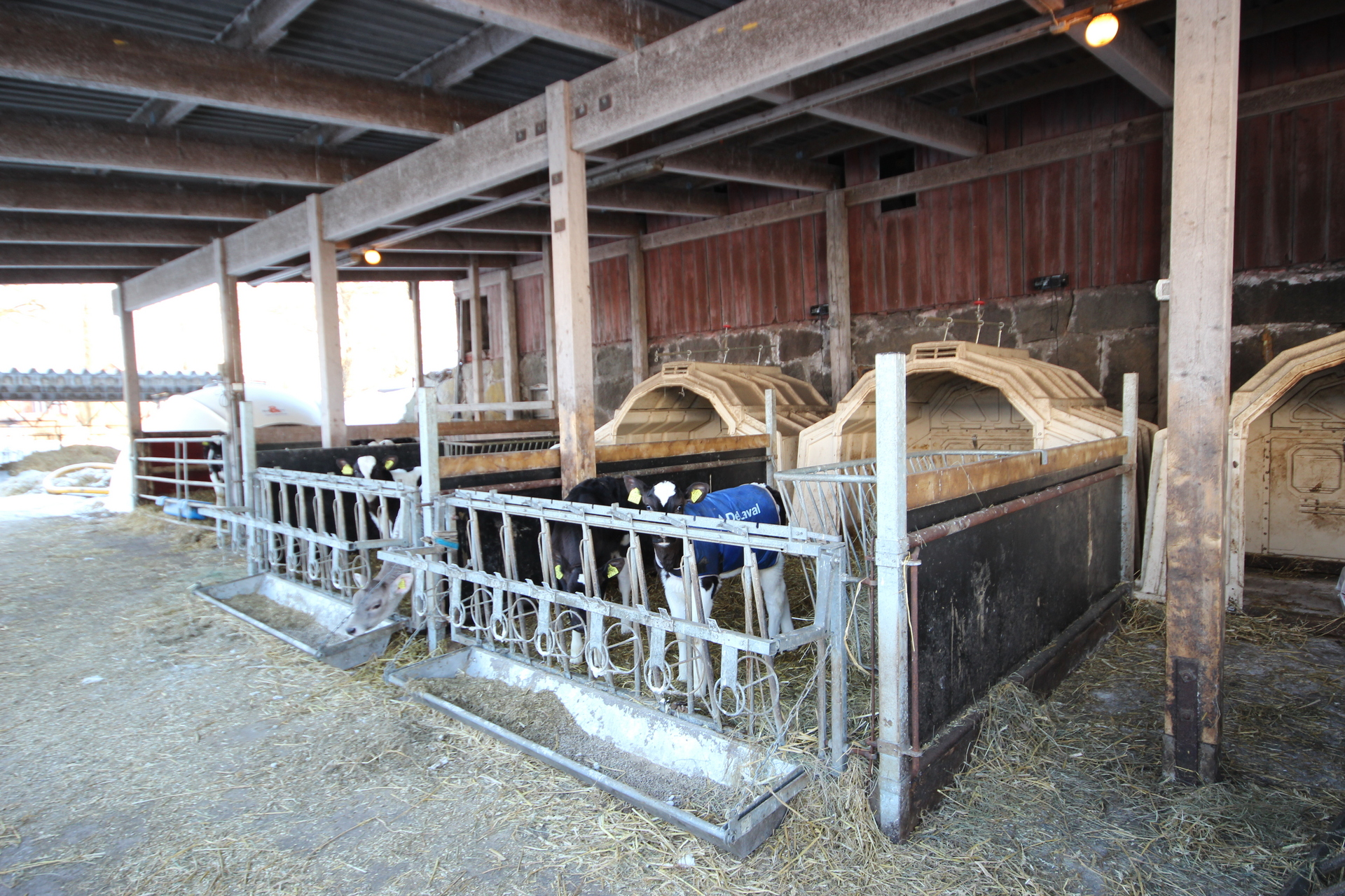 Beskrivning: Vidbyggt snedtak vid gamla ladugården med plåttak och betonggolv. Byggnaden är indelad i flera avdelningar med kalvhyddor och foderbord.