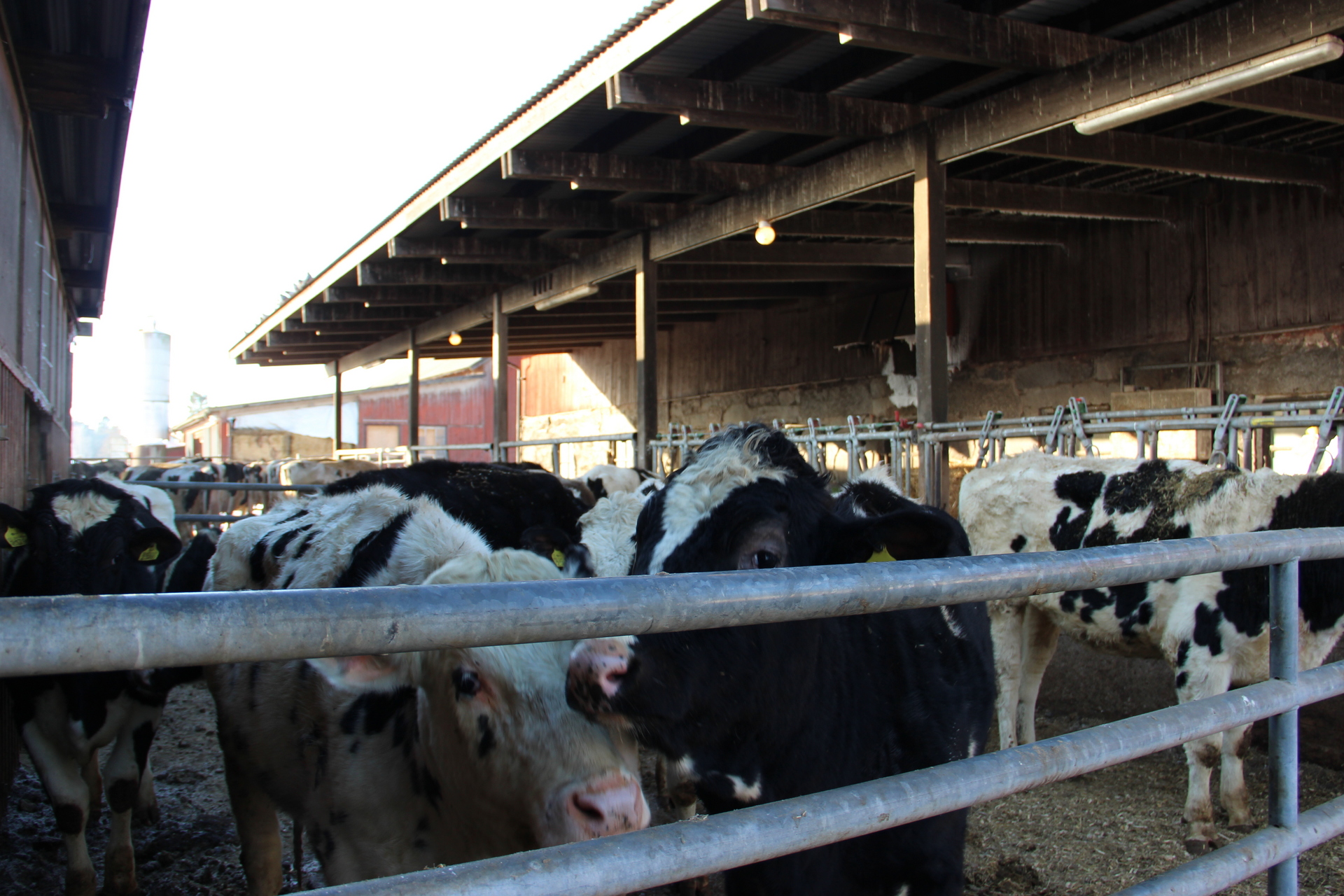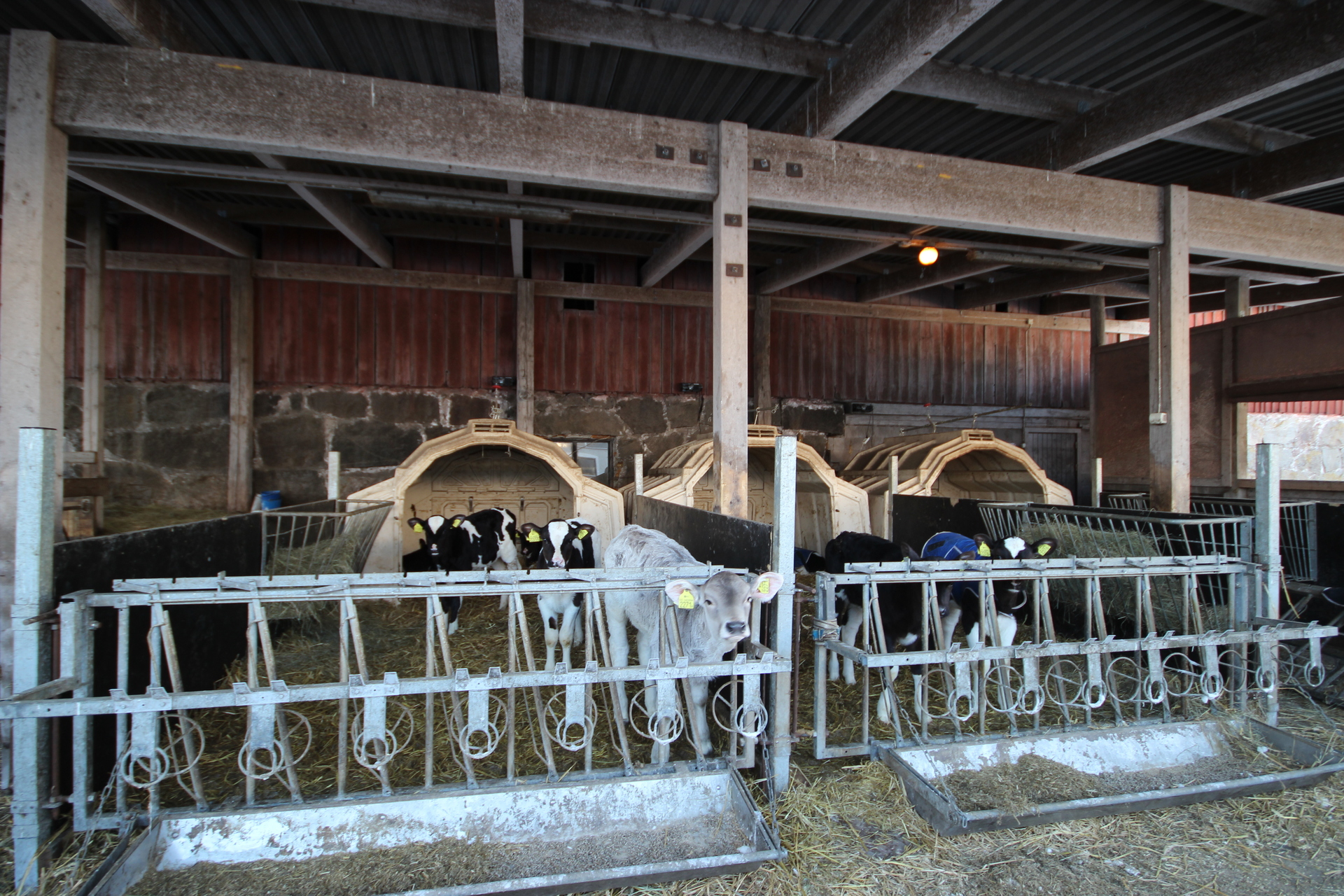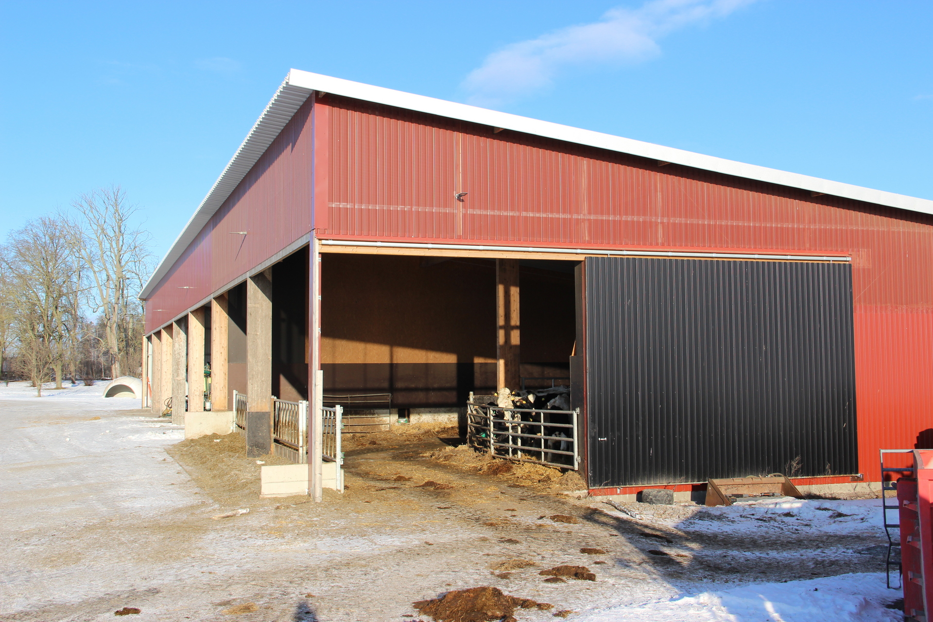 Beskrivning: Vidbyggt snedtak vid gamla ladugården med plåttak och betonggolv. Byggnaden är indelad i flera avdelningar med kalvhyddor och foderbord.