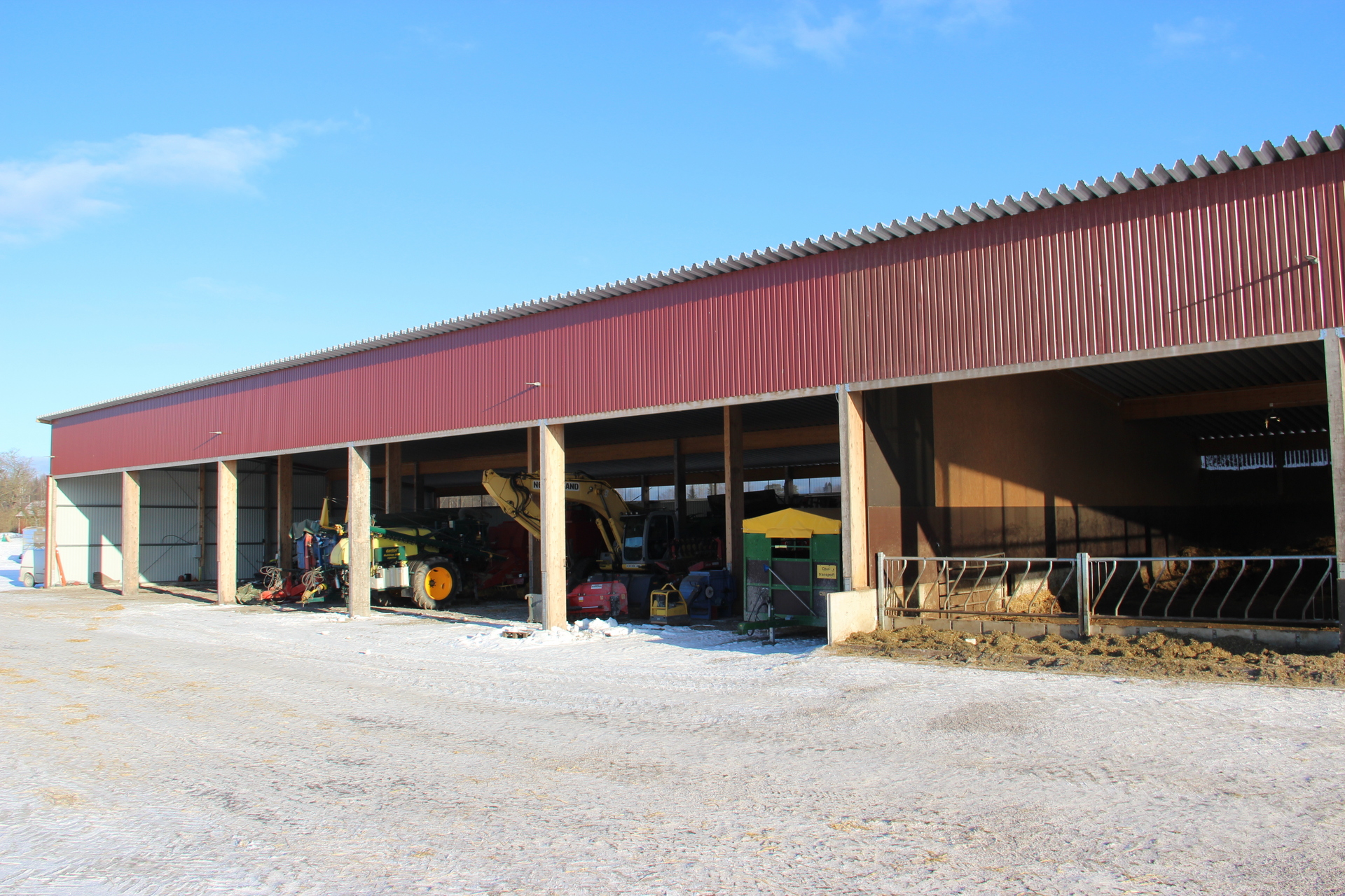 Beskrivning: Maskinhall med 7 fack med måtten 8 m x 21 m, grus/betonggolv, limträstomme med plåtväggar och plåttak. Två fack används som lösdrift för ungdjur och har elvattenkoppar, stödmur av betong, skivade väggar och flyttbart betongfoderbord. Utrymmet används också vid skörd som planlager av spannmål.