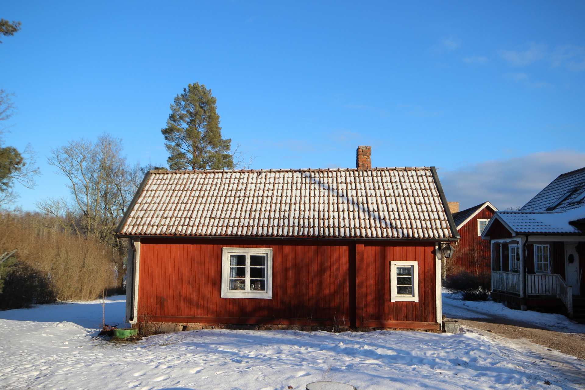 Beskrivning: Träbyggnad med tegeltak, eldstad och murad skorsten. Byggnaden används som trädgårdsförråd.